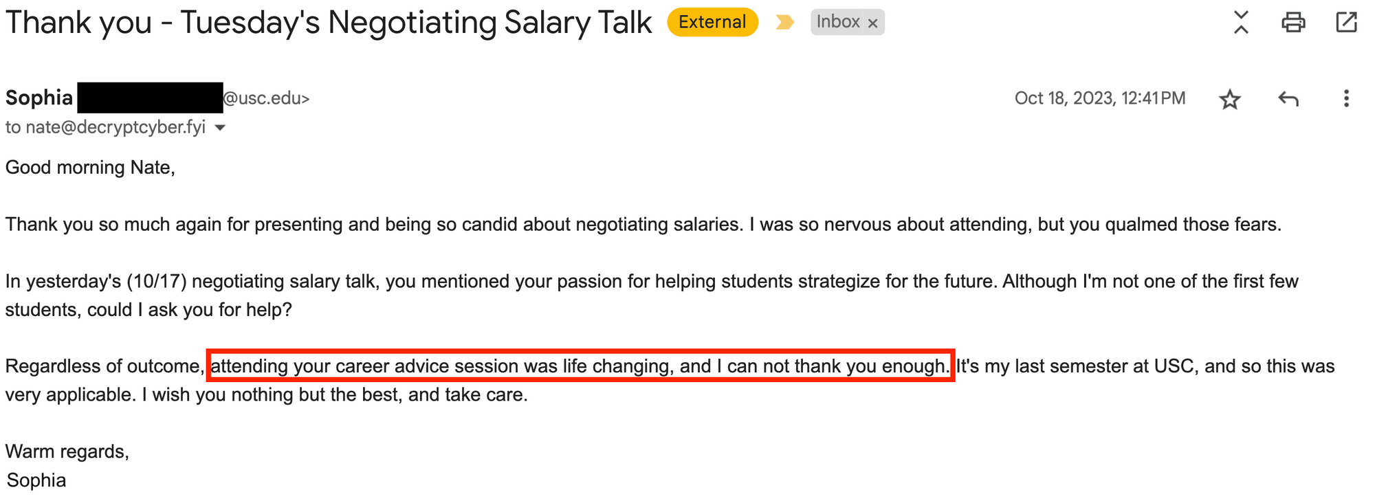 Check out the Wall of Love for 15 video testimonials of students who landed jobs, got promotions, and negotiated higher salaries with Decrypt Cyber.